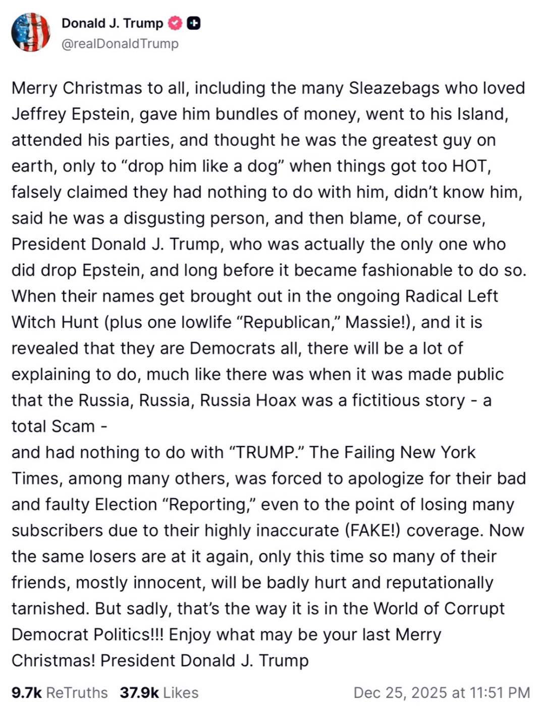Hours later, he posted a second Christmas message, this time aimed at Jeffrey Epstein and the people Trump alleges once “loved” him, funded him, visited his island, attended his parties, then “drop[ped] him like a dog” when the heat arrived. Trump framed the Epstein story not as a criminal scandal with victims, documents, and long-standing public record, but as a political weapon wielded against him: a “Radical Left Witch Hunt,” an extension of the familiar Trump cosmology where all scrutiny is hoax, all institutions are corrupt, and all accountability is partisan theatre. (Newsweek: 2025; New York Post: 2025).