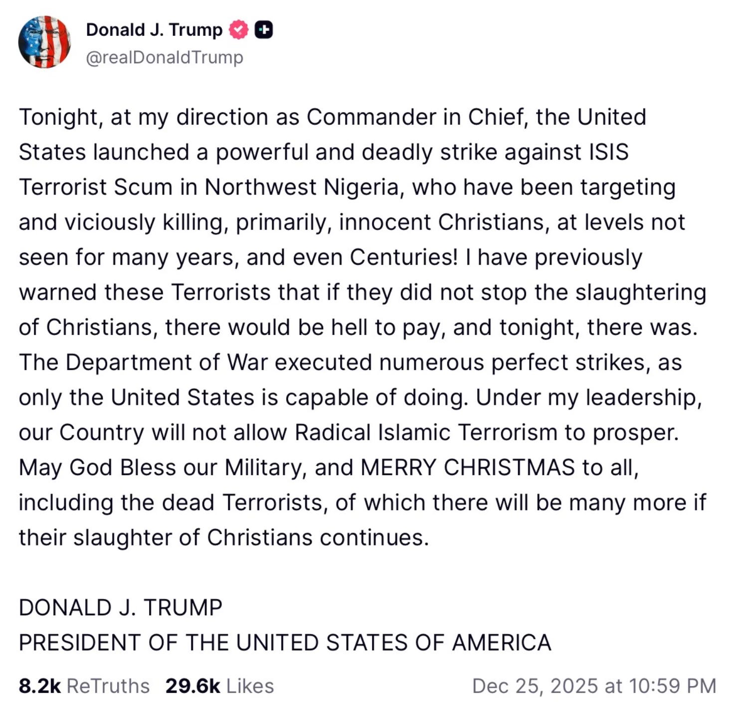 In the first, Trump announced that the United States had launched airstrikes against Islamic State militants in northwest Nigeria. He described a “powerful and deadly strike” against “ISIS Terrorist Scum,” claimed the group had been “targeting and viciously killing, primarily, innocent Christians,” and warned there would be “many more” dead if the “slaughter of Christians continues.” He also referred to the Pentagon as the “Department of War,” praised “numerous perfect strikes,” and ended with the grotesque fusion of holiday greeting and death wish: “MERRY CHRISTMAS to all, including the dead Terrorists.” (Reuters: 2025; The Guardian: 2025).