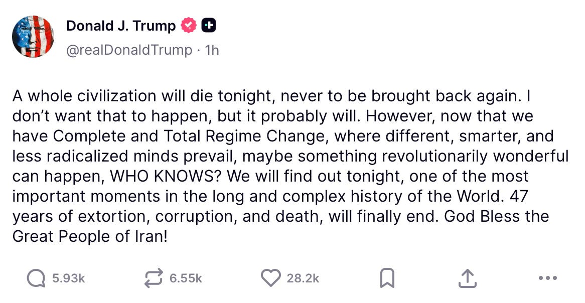 The words arrived on a Tuesday evening, casually dropped into the digital ether between a complaint about a judge and a boast about poll numbers. “A whole civilization will die tonight, never to be brought back again,” the President of the United States wrote. “I don’t want that to happen, but it probably will.” He then pivoted, in the very same breath, to celebrating “Complete and Total Regime Change” and offering a benediction: “God Bless the Great People of Iran!”