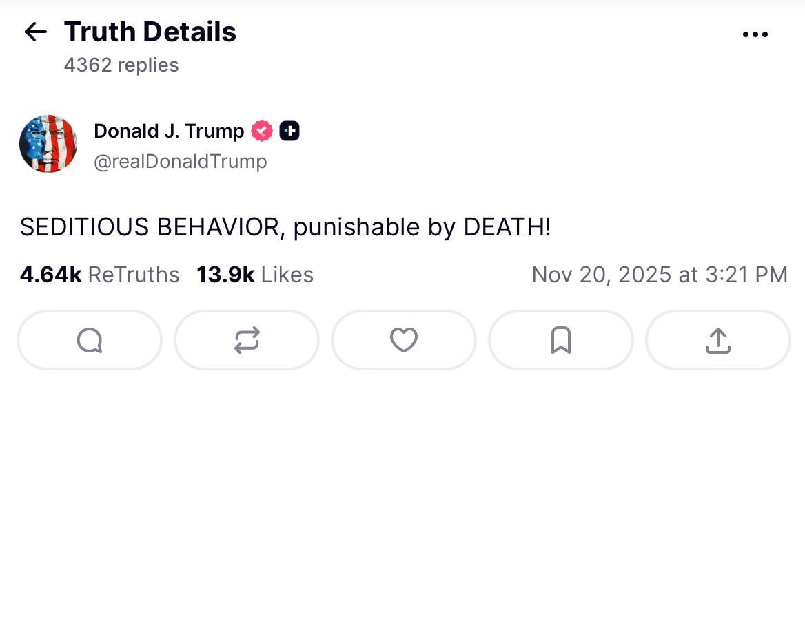 For this, Trump declared their actions “SEDITIOUS BEHAVIOR, punishable by DEATH!” He then, in an act of random terror, reposted a supporter’s frothing demand to “HANG THEM GEORGE WASHINGTON WOULD!!” (PolitiCo, 2025).
