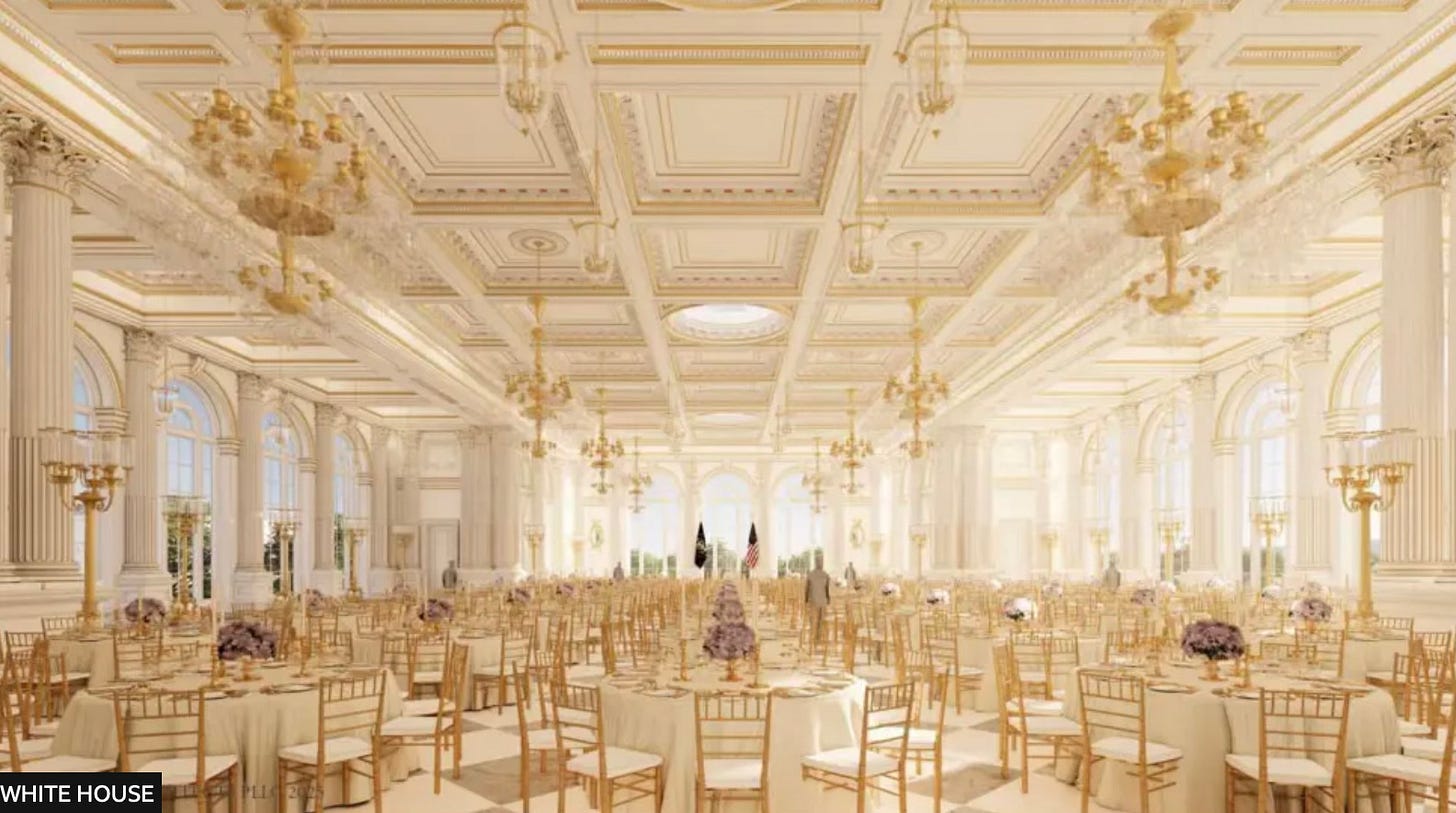 The gilded aesthetic of the new ballroom is a perfect expression of architectural narcissism. The mirrors, the chandeliers, the cream-and-gold tones - all of it communicates a fantasy of wealth and celebrity, not a national ethos. This is not an architecture that speaks of democratic values - of humility, service, and the common good. It is an architecture that speaks of personal enrichment, of luxury as a sign of virtue, of power as a tool for self-aggrandisement. Trump is not building for the country; he is building for the camera, for his wealthy donors, and for himself.