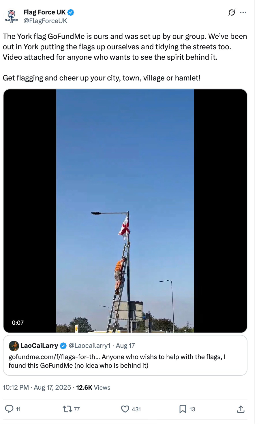 When Operation Raise the Colours first surfaced online, it styled itself as a grassroots initiative. The premise was simple: ordinary people, fed up with ‘political correctness’ and ‘woke elites,’ would reclaim public space by plastering it with England’s flag. Local X groups popped up under names like York Flag Force UK and Weoley Warriors. Supporters proudly posted photos of lampposts newly decorated, roundabouts freshly painted, and bunting strung across streets.